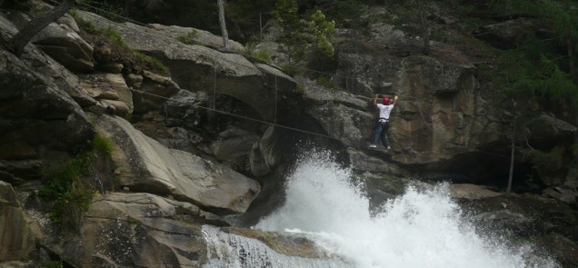 Ein „crazy“ Klettersteig, der derzeit sicher einzigartig in Österreich ist. Man könnte ihn vielleicht auch Fun-Klettersteig nennen, wobei die Schwierigkeiten der kurzen Teilstücke nicht zu unterschätzen sind.